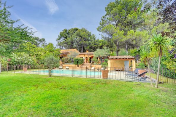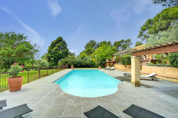 Rare for sale family property in the town of Cabries in absolute calm, close to international schools. This 353 m² property on 10,665 m2 of wooded land, is divided into a dining room, a living room, a living room, an American kitchen, a bar area, 5 bedrooms (including a master suite), a bathroom, 4 bathrooms. of water as well as 6 toilets. The property benefits from a type 2 apartment with independent entrance. It offers a relaxation area with a secure swimming pool, a large pool house with bar, an outdoor lounge area and barbecue that will seduce you. The southern exposure gives you optimal brightness all day. Its magnificent open view, its very good condition and its excellent luminosity make it a unique property. Aix-en-Provence Sotheby's International Realty, the benchmark for luxury real estate in Aix en Provence. Mandate 797