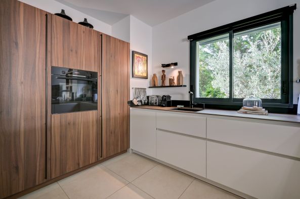 Ground floor – Entrance hall with living room featuring a fully equipped "LEICHT" kitchen open to the dining and living areas, access to the terrace – Separate WC – Access to the garage
