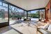 The spacious living and dining area, featuring high ceilings and a fireplace insert, creates a warm and welcoming atmosphere. It opens onto a light-filled veranda overlooking the garden and swimming pool area, providing optimal natural light throughout the day. The ground floor hosts a master suite with a walk-in dressing room and bathroom, while the upper floor offers three bedrooms, each with its own washbasin, complemented by a shared shower room.