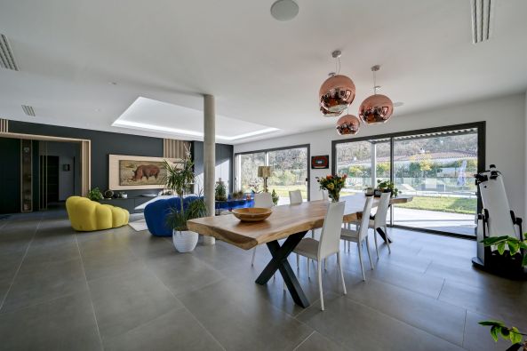 Propriété contemporaine aux portes d’Aix-en-ProvenceIdéalement située dans l’un des secteurs les plus recherchés au Sud d’Aix-en-Provence, cette propriété rare séduit par son environnement verdoyant ainsi que son emplacement privilégié et particulièrement convoité. Implantée au cœur d’un magnifique jardin arboré et entretenu d’environ 4 071 m², cette propriété sécurisée développe une surface habitable d’environ 220 m², complétée par une dépendance de 60 m². L’ensemble bénéficie d’une exposition plein Sud, offrant une luminosité exceptionnelle tout au long de la journée, jusqu’au coucher du soleil. Dès l’entrée, les volumes généreux et la qualité des matériaux donnent le ton. La pièce de vie, élégante et baignée de lumière, s’ouvre sur une cuisine contemporaine entièrement intégrée, idéale pour recevoir. Le rez-de-chaussée accueille également un cellier-buanderie, une superbe suite parentale avec salle de bains et dressing, ainsi qu’une chambre d’amis avec salle d’eau privative. À l’étage, l’espace nuit se compose de trois chambres lumineuses, aux volumes harmonieux, se partageant une salle de bains et des sanitaires indépendants. Chaque chambre bénéficie d’une atmosphère paisible avec des vues dégagées sur la végétation environnante. Le sous-sol, d’environ 60 m², abrite une salle de cinéma privée, véritable atout pour les amateurs de loisirs et de convivialité. À l’extérieur, la piscine chauffée au sel, parfaitement intégrée à son environnement, constitue le point central des espaces de détente. Le pool-house exposé plein Sud, équipé d’une pergola bioclimatique, prolonge les moments de convivialité et invite à profiter pleinement du climat provençal, en toute saison. Une demeure idéale pour une résidence principale comme secondaire, offrant un cadre de vie privilégié à quelques minutes seulement du cœur d’Aix-en-Provence. Aix en Provence - Sotheby's International Realty, la référence internationale de l'immobilier de prestige à Aix en Provence. Energy and climate performance